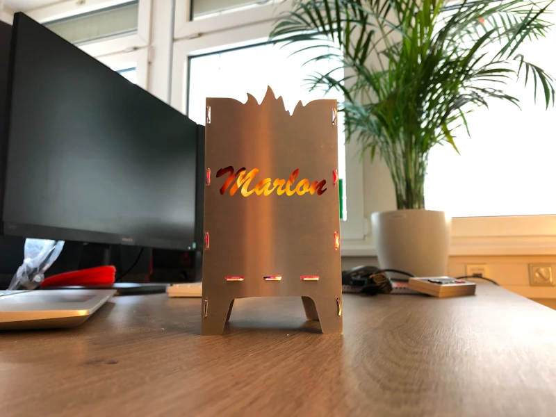 Jedes Teelicht wird einzeln gefertigt, geprüft und mit modernster Lasertechnik veredelt. Die Gravur ist dauerhaft eingebrannt und bleibt auch bei häufiger Nutzung erhalten. Der Halter besteht aus 1 mm gebürstetem Edelstahl und wird so verarbeitet, dass das Licht sanft durch die ausgeschnittenen Buchstaben schimmert – ein feines Detail mit großer Wirkung.